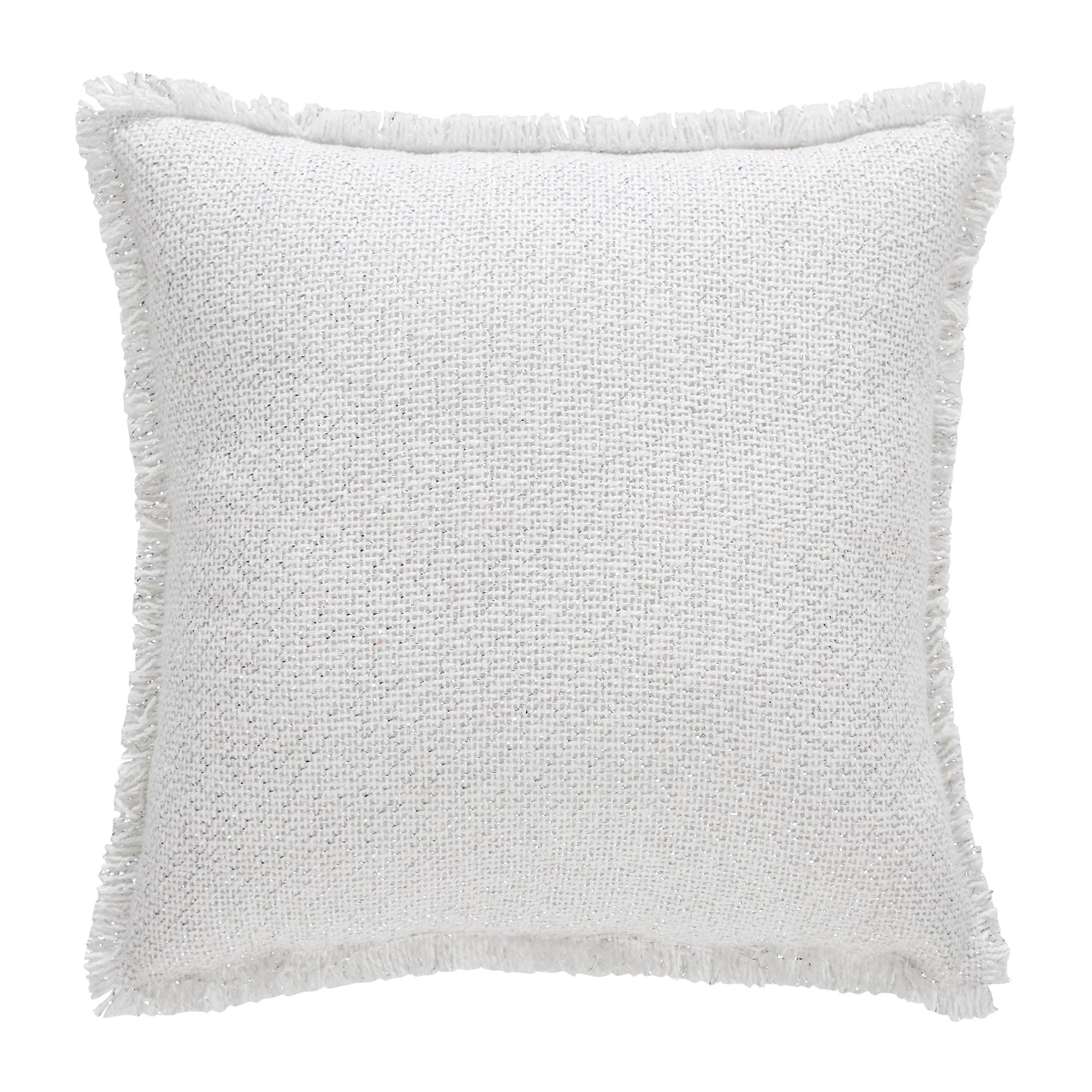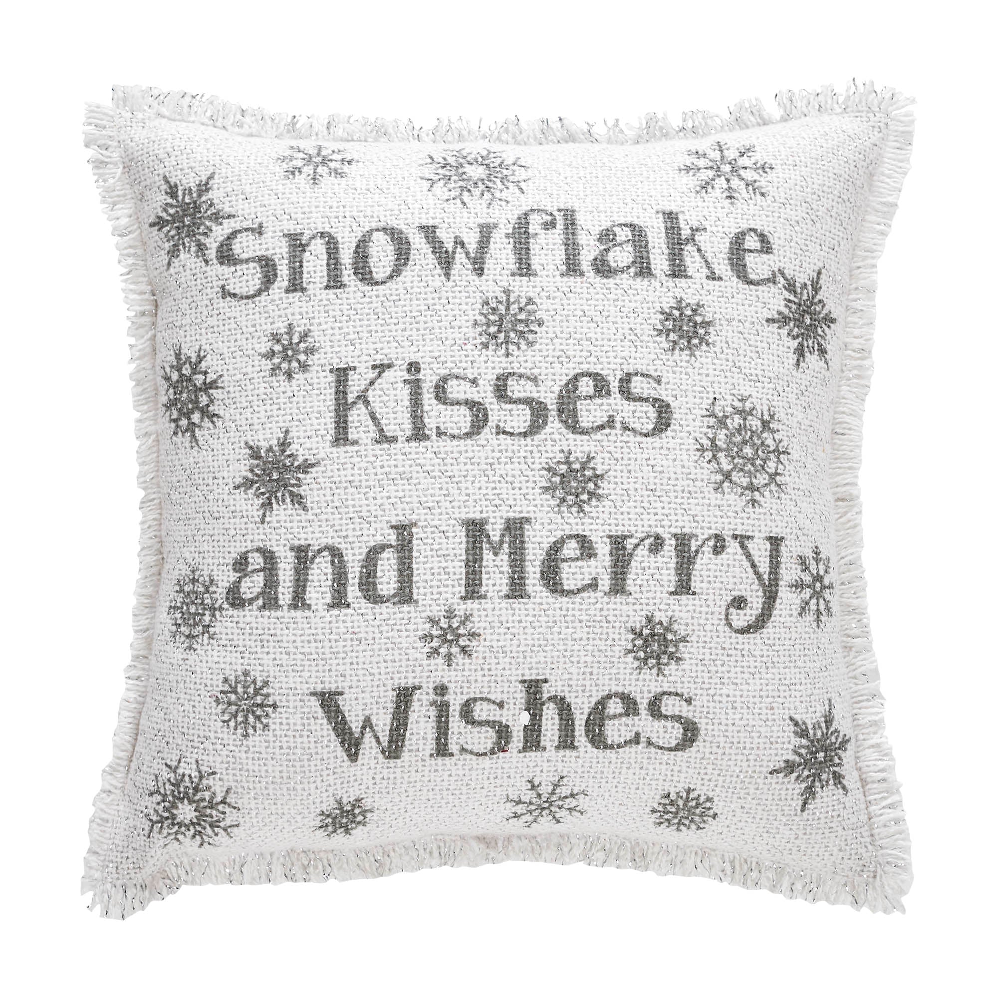 Festive 12 x 12 inch pillow featuring snowflakes and text on burlap in antique white and dove gray. Reverses to a metallic silver fleck design for added elegance. Soft fringe border brings cozy farmhouse charm to any holiday décor.